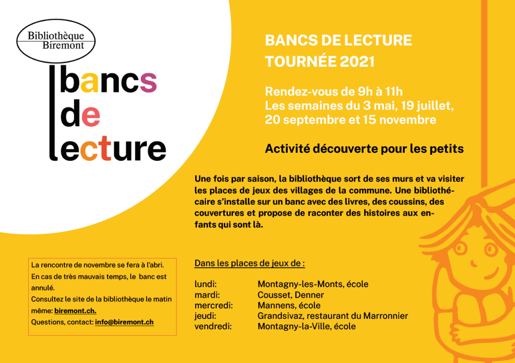Bibliothèque Biremont: Bancs de lecture. Activité découverte pour les petits, dans les places de jeu des différents villages de Montagny.