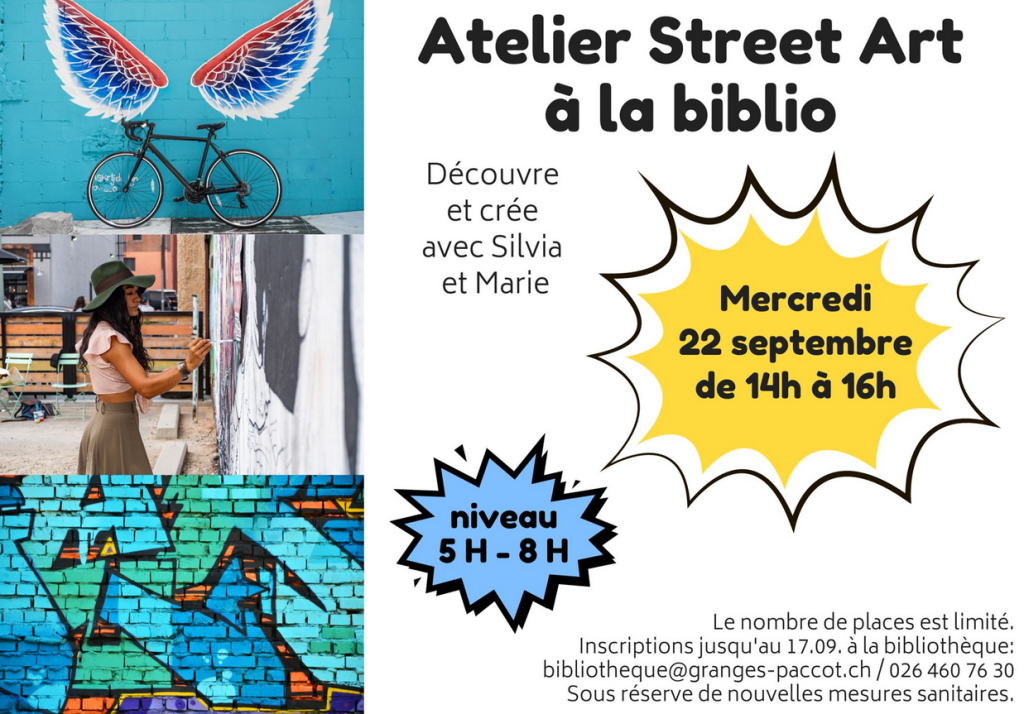 Mercredi 22 septembre 2021, de 14h00 à 16h00, un atelier « Street Art » aura lieu à l’espace Jean Perriard à Granges-Paccot.