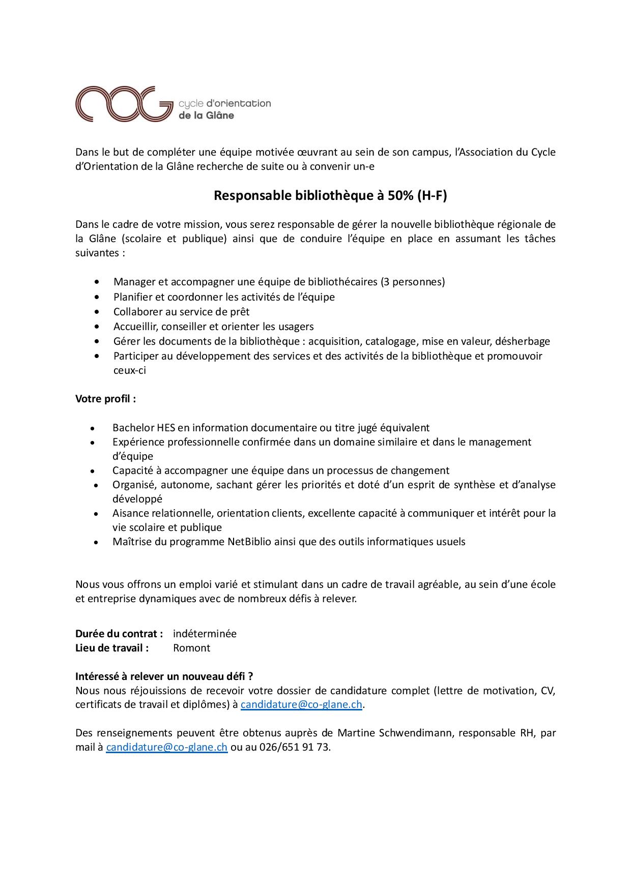 Nous nous réjouissions de recevoir votre dossier de candidature complet (lettre de motivation, CV, certificats de travail et diplômes) à candidature@co-glane.ch.