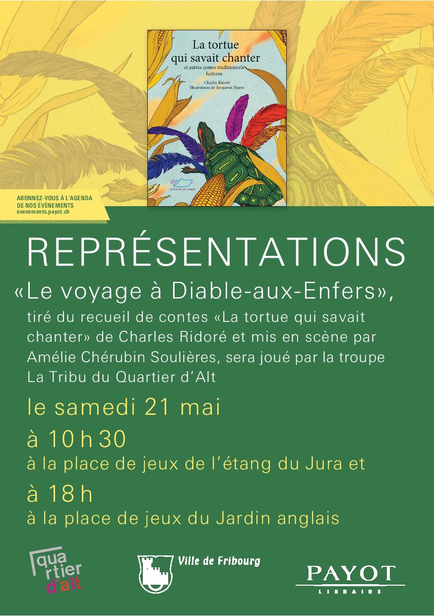 Le voyage à Diable-aux-Enfers, tiré du recueil de conte La tortue qui savait chanter : mis en scène par Amélie Chérubin Soulières et joué par la troupe « La Tribu du Quartier d’Alt »
