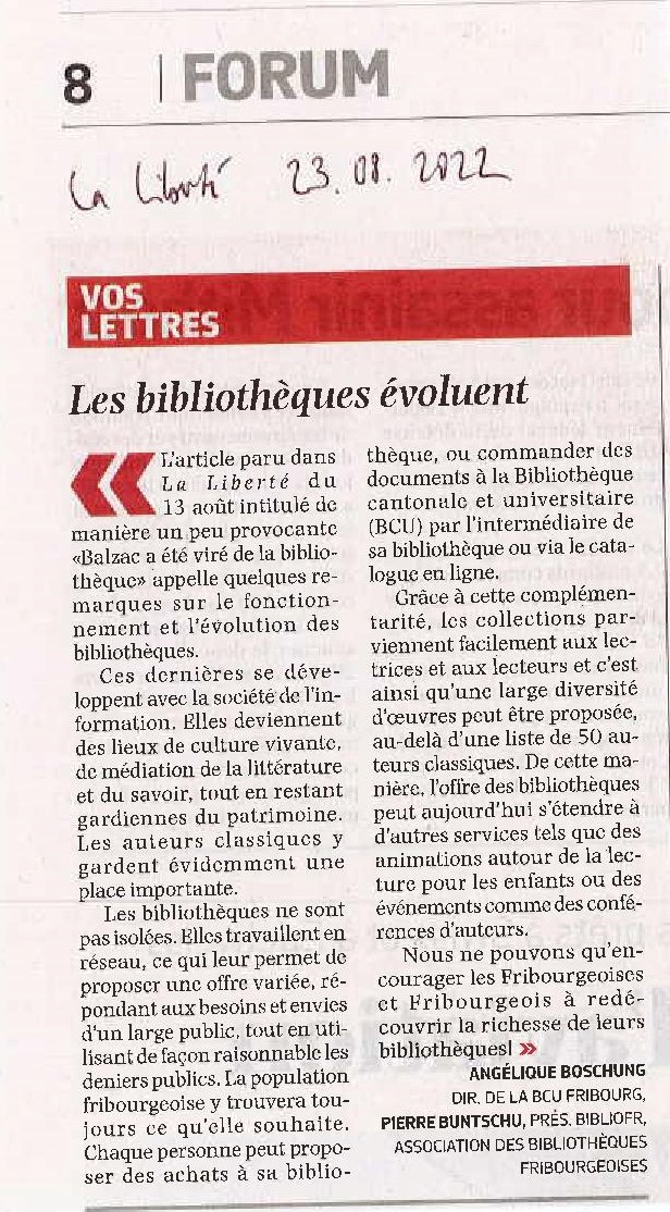 Suite à l’article paru dans la Liberté du 13 août 2022 intitulé « Balzac a été viré de la bibliothèque », Angélique Boschung (directrice de la BCU) et Pierre Buntschu (président de BiblioFR) précisent, dans leur lettre de lecteur du 23.08.2022, que les auteurs classiques gardent toujours une place importante dans les bibliothèques. Cependant, les bibliothèques