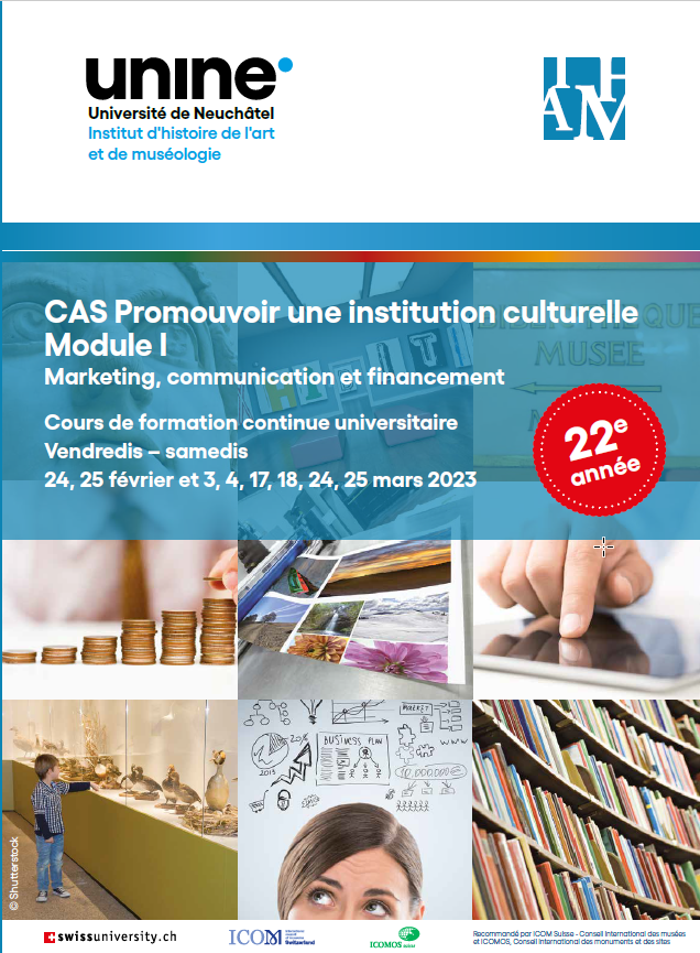 L’Institut d’histoire de l’art et de muséologie (IHAM) de l’Université de Neuchâtel annonce que l’édition 2023 du module I du CAS « Promouvoir une institution culturelle », se tiendra les 24 et 25 février & 3, 4, 17, 18, 24 et 25 mars 2023.