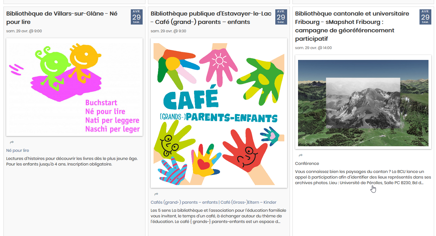 Les bibliothèques fribourgeoises sont actives et proposent de nombreux événements pour petits et grands. Outre les heures du conte, les rencontres Né pour lire, les clubs-lecture ou les ateliers de science, des ateliers des « ExplorActifs », une animation jeux vidéo parent-enfants et une campagne de géoréférencement participatif sont proposés.