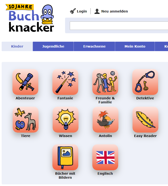 Buchknacker ist eine Online-Bibliothek mit Hörbüchern und E-Books. Die Zusatzfunktionen der digitalen Bücher unterstützen den Leseprozess. Aktuell werden über 60‘000 Titel, darunter mehr als 7‘000 Kinder- und Jugendbücher, zur Ausleihe angeboten. Von Abenteuer- und Detektivgeschichten über Fantasy-Romane bis hin zu Sachbüchern gibt es jede Menge Spannendes zu entdecken. Viele Bücher sind mit dem beliebten Antolin-Quiz verlinkt. Mit einem persönlichen Login können die Bücher ausgeliehen und online angehört oder gelesen werden. Anmeldung und Ausleihe sind bis 18 Jahre kostenlos.