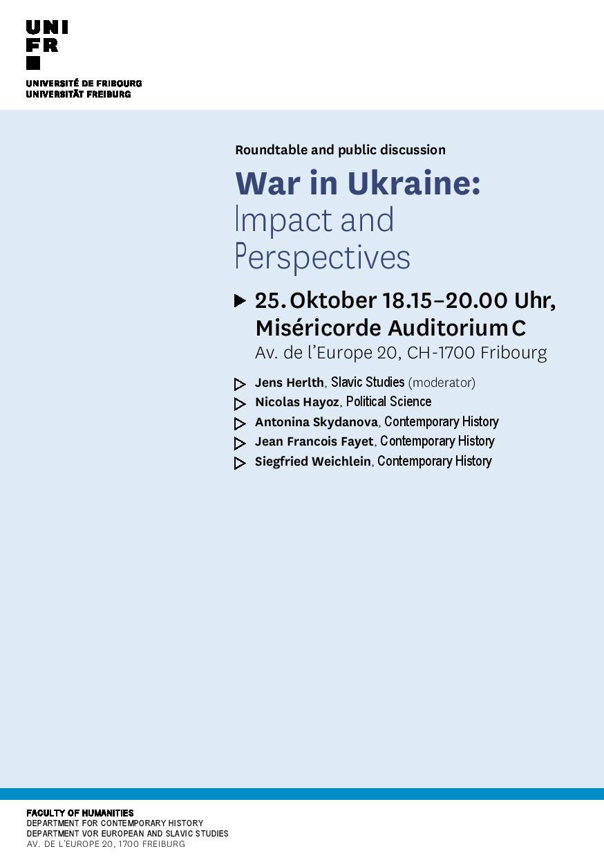 L’Université de Fribourg propose une table ronde portant sur le thème « Guerre en Ukraine : impact et perspectives », avec des expert-e-s en histoire contemporaine et en politologie. C’est une occasion de s’informer sur cette guerre, au-delà de la masse d’informations et des Fake News !