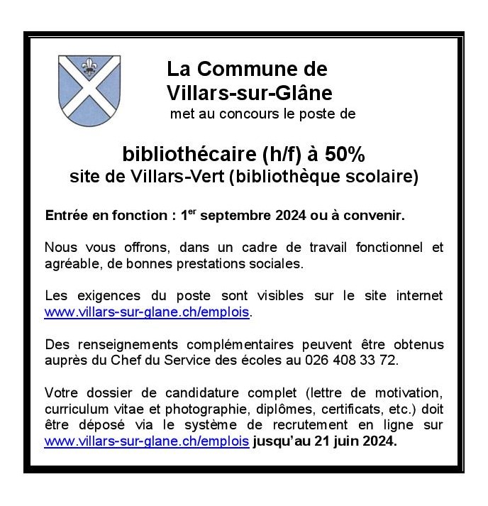 Les exigences du poste sont visibles au lien suivant : www.villars-sur-glane.ch/emplois