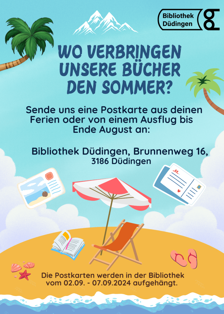 - Ausstellung der Postkarten der Düdinger Leserinnen und Leser («Wo verbringen unsere Bücher den Sommer?»)