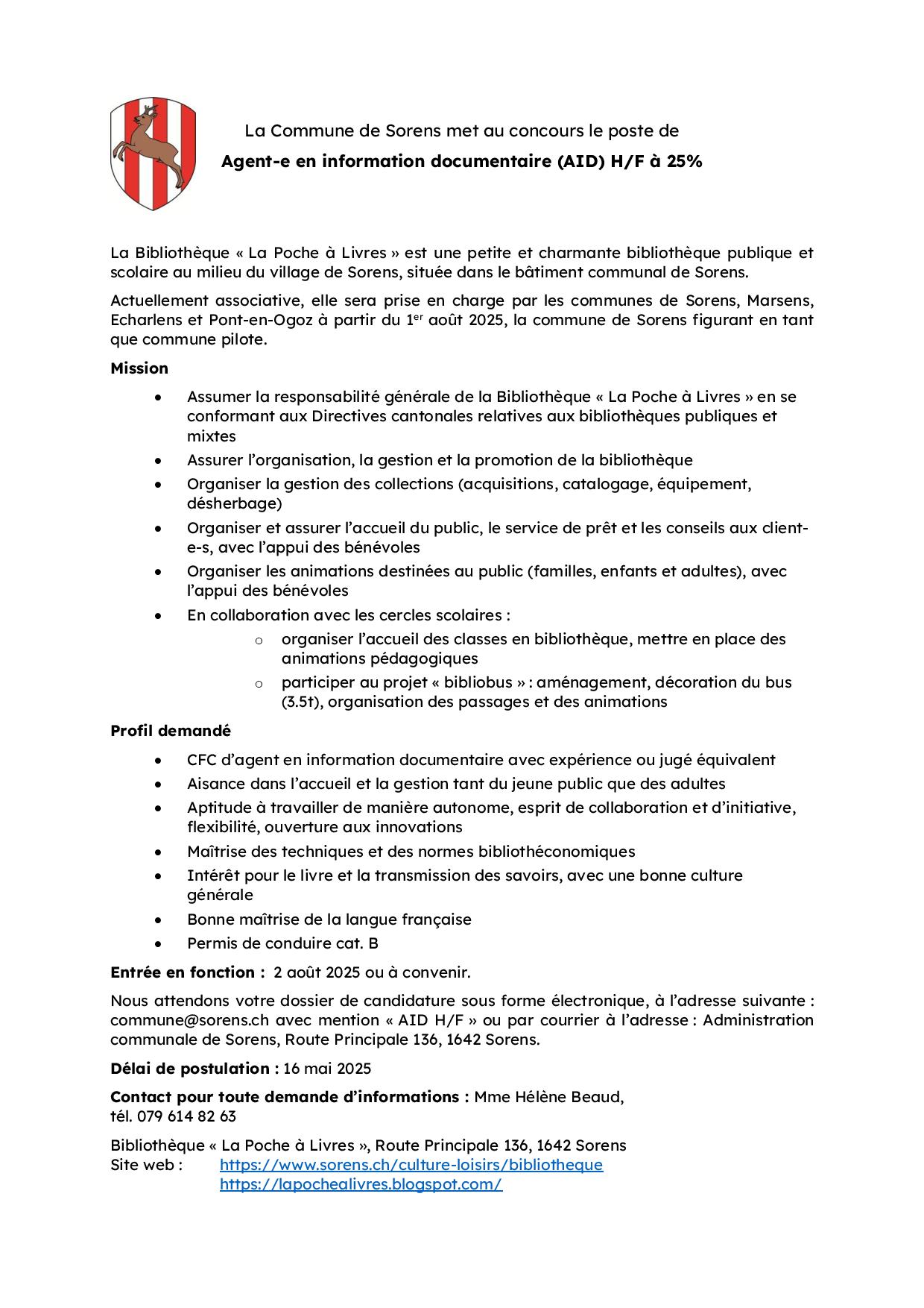 Nous attendons votre dossier de candidature sous forme électronique, à l’adresse suivante : commune@sorens.ch avec mention « AID H/F » ou par courrier à l’adresse : Administration communale de Sorens, Route Principale 136, 1642 Sorens.